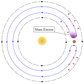 On the other hand, behind the planet a defect of mass occurs, because the horseshoe orbit transports the gas away from the planet. Gas that performed the U-turn in front of the planet now finds itself close to the inner edge of the gap. Due to the rapid inward motion caused by the wind, this gas then quickly leaves the co-orbital region again by entering the inner disk and will not librate all the way to the back side of the planet, leaving this region devoid of gas. The region in front of the planet is now steadily populated with gas, the planet only gains angular momentum and thus migrates outward.